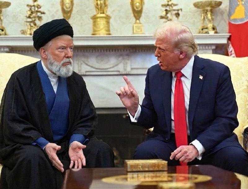 Apoi ne informează că Strâmtoarea Hormuz va fi administrată de el. De el şi de ayatollah. La început n-am înţeles cum vine asta, ulterior am priceput, când ne-a spus că i s-a propus să fie el ayatollah la iranieni, dă-l dreacu pe Khamenei, a fost ales la mişto. N-ai cum să nu-l crezi. Îl crezi, că e adevărat. Am şi poze, de la discuţiile între el şi ayatollah: